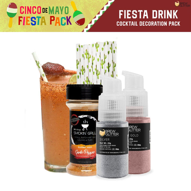 Satisfy everyone's cocktail cravings with our Cinco de Mayo Fiesta Drink Decorating Kit. Created with a refreshing and stunning mango flavored fiesta cocktail in mind, this mixology kit features our Silver and Rose Gold edible drink glitter, fun cactus printed party straws and savory gourmet garlic pepper seasoning to add a kick to your garnishes or beverage. This convenient combo pack will make every moment a celebration.