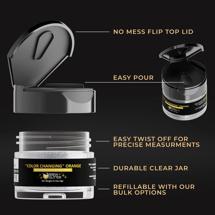 Our food grade Orange Brew Glitter® is the perfect compliment for cocktails, beer, spirits, wine, champagne, tea, ice coffee, soda, lemonade & any other alcoholic or non-alcoholic beverage you can think of! Simply pinch a small amount of Brew Glitter® in your favorite beverage and watch your drink shimmer, swirl & sparkle! Everyone at your party, wedding, brunch, dinner event or celebration will be WOW'd!