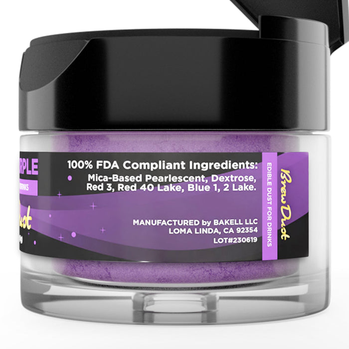 Our Brew Dust products contain various mica powder pigments and undergo a specific manufacturing process that makes the mineral edible and consumable. Common ingredients in edible glitters or dusts may include acacia (gum arabic), maltodextrin, cornstarch, and color additives specifically approved for food use, including mica-based pearlescent pigments and FD&C colors such as FD&C Blue No. 1. Importantly, our products are free of Red Dye No. 3.